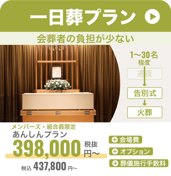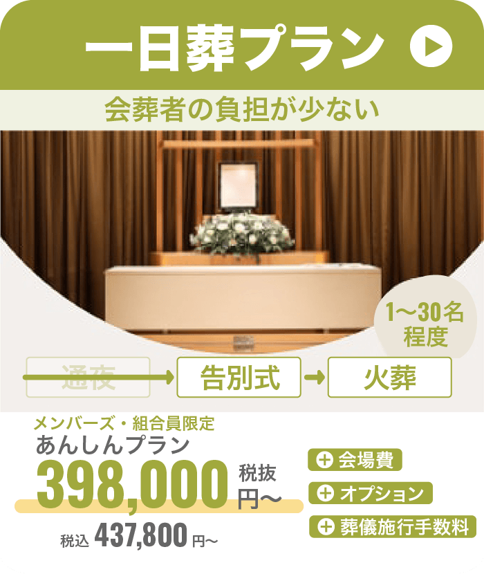 一日葬は通夜式を省略し、 告別式のみを行う葬儀形式です。短い時間で葬儀が終わるため、ご家族の経済的・肉体的負担を軽減出来ます。