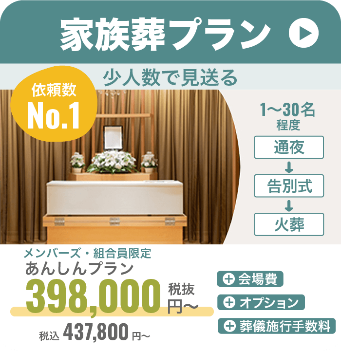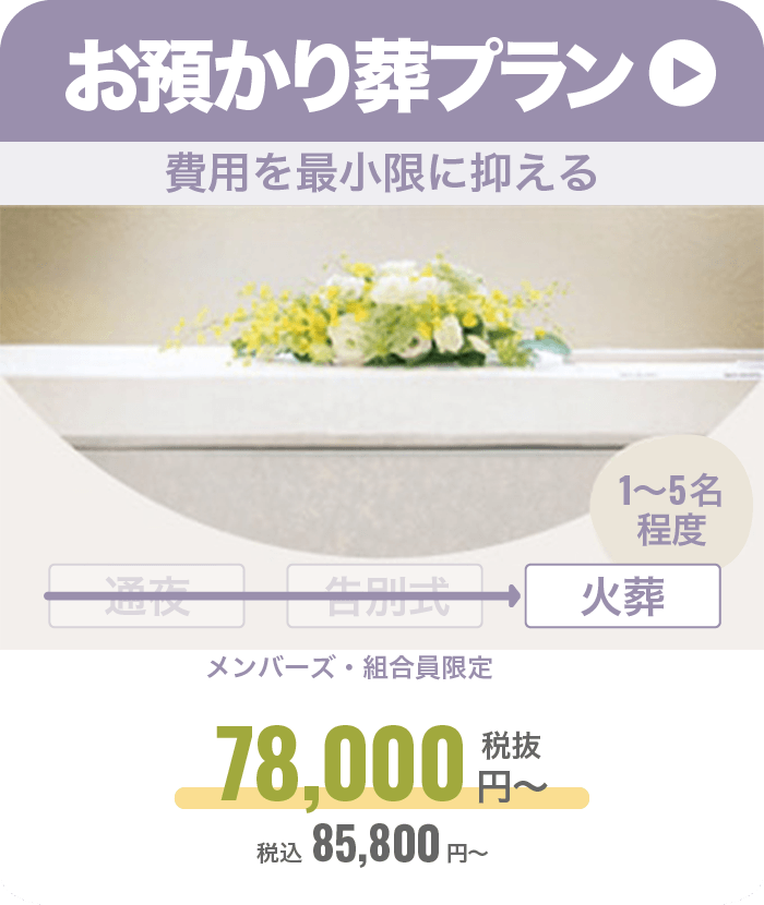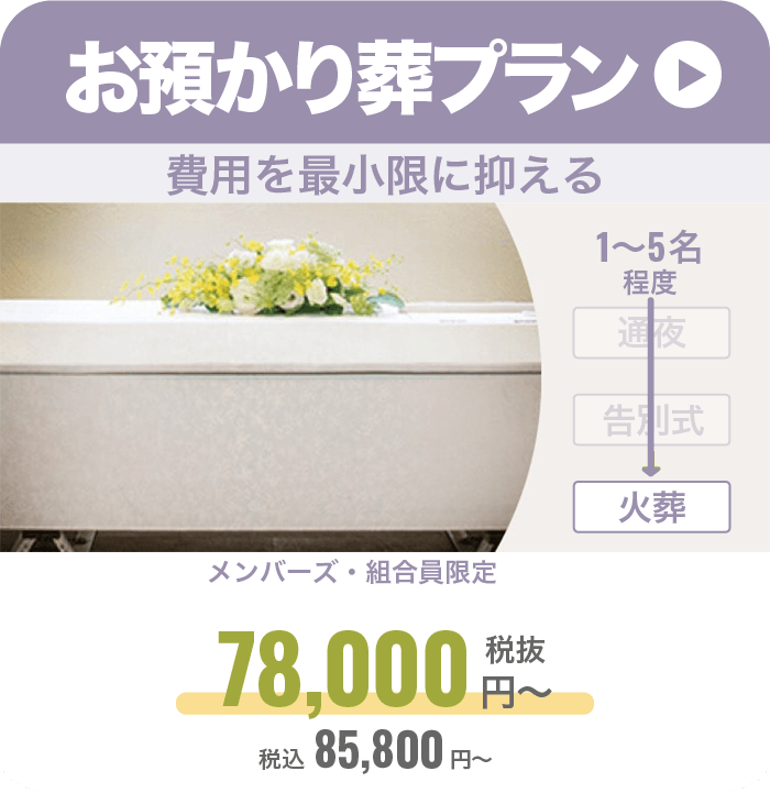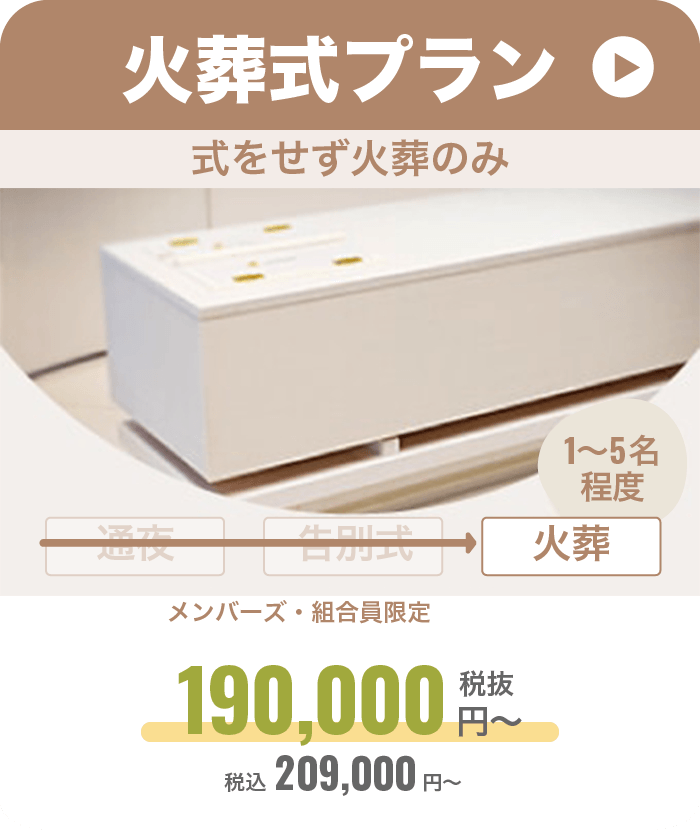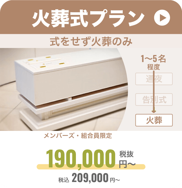 火葬式プランは、宗教儀式を行わず、火葬・出棺を行う葬儀形式です。様々なご事情で極力費用を掛けたくない方に適しています。